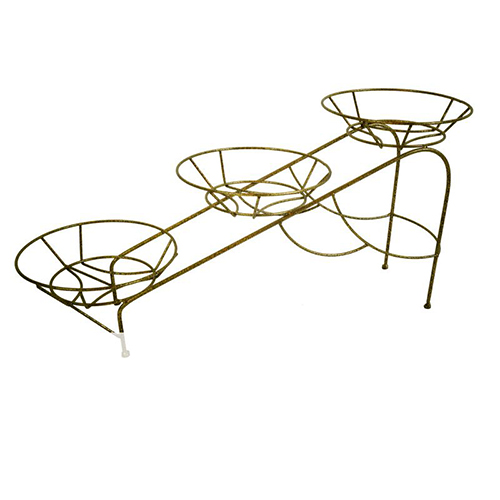 Настольная подставка для цветов «Горка», рассчитанная на 3 горшка, полностью оправдывает свое название. Она сделана из прочного стального прутка диаметром 6мм и окрашена специальной порошковой краской «антик – золото». Изделие состоит из 3 корзинок (нижнее кольцо корзинки 14,5см, верхнее кольцо корзинки 22см, высота корзинки 3,5см) и, благодаря своей форме, поможет Вам просто и красиво разместить свои растения в интерьере. Подставка имеет устойчивое основание, вес ее составляет 1,1кг.