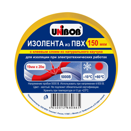 Клейкая лента UNIBOB электроизоляционная 19мм х 20м 150мкм желтая ИУ арт.59489 (60шт)