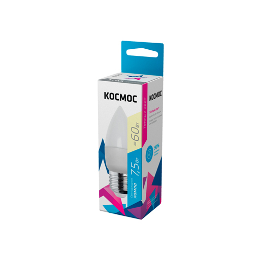 Лампочка в форме «свеча». Мощность 7,5 Вт — аналог лампы накаливания 60 Вт.