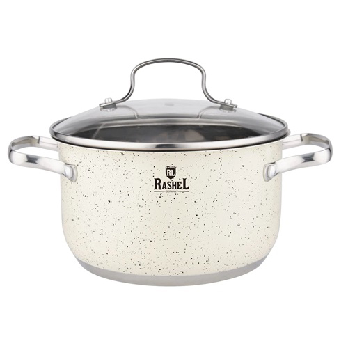 Кастрюли торговой марки "RASHEL" выполнены из высококачественной нержавеющей стали (18/10 - соотношение хром/никель). На корпус кастрюли нанесено антипригарное гранитное покрытие. Кастрюли удобны в использовании, за ними легко и просто ухаживать. Многослойное капсульное дно равномерно распределяет тепло и долгое время сохраняет достигнутую температуру, тем самым обеспечивает равномерный нагрев и равномерную подачу тепла во внутрь кастрюли.