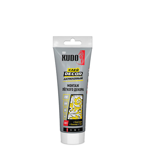 Высококачественный универсальный акриловый клей KUDO® «DECOR» специально разработан для монтажа нетяжёлых изделий из древесины, ДСП, ДВП, EPS, XPS, ПВХ и UPVC на бетонные, кирпичные, каменные, металлические, оштукатуренные и деревянные поверхности. Рекомендуется для монтажа изделий из гипса, пенопласта, полистирола и т.д.
