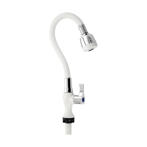 Кран на одну воду из высокопрочного пластика АБС, белого цвета, с гибким изливом, с двухрежимным большим аэратором. Крепление резьба - гайка. Кранбукса м/к, ручка флажок, поворот на 90?. Габаритные размеры: высота 310 мм, регулировка расположения излива 210 мм, диаметр посадочного седла 40 мм, длина резьбы 55 мм. Вес - 0.011 кг, объём - 0.0030 м3. В комплекте корпус, крепёж.