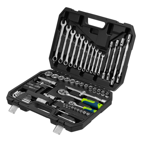 Набор инструментов Сибртех 13396 упакован в пластиковый кейс и состоит из 89 предметов с присоединительным размером 1/2"" и 1/4"", предназначенных для монтажа и демонтажа резьбового крепежа с разными типами шлицев. В комплект поставки входят карданы, удлинители и шарнирные ключи, облегчающие работу в труднодоступных местах. Набор используется для ремонта автомобилей, а также полезен в быту.