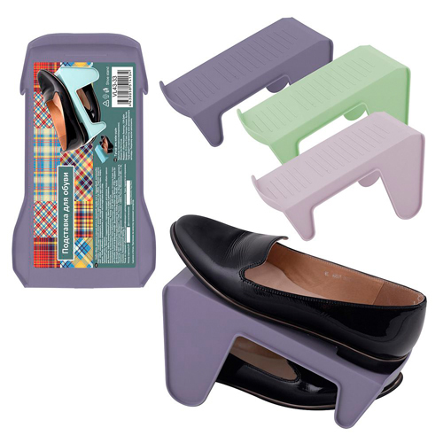 Чтобы обувь занимала меньше места в прихожей или в шкафу, используйте подставку. С такой подставкой можно разместить вдвое больше пар обуви на полках или в гардеробной. Изделие представляет собой наклонную поверхность, внизу которой размещается одна часть пары, сверху — вторая. Чтобы избежать соскальзывание, в нижней части изделия есть упор.