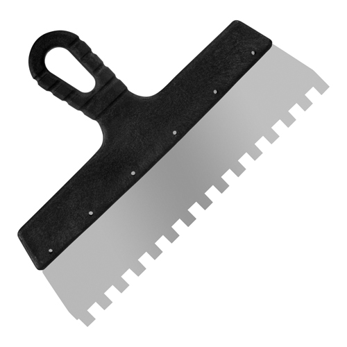 Материал: нержавеющая сталь, пластиковая рукоятка, квадратный зуб. Толщина стали – 0,4 мм. Применение: для нанесения клеевых составов, цементных монтажных смесей при укладывании кафельной плитки, приклеивании стеновых панелей.