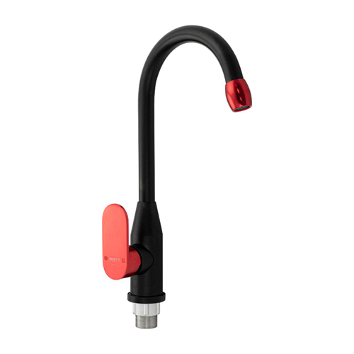 Смеситель для кухонной мойки и раковины, из авиационного алюминия, черного цвета с красной ручкой и аэратором, боковой, с высоким С-образным изливом, шаровый. Крепление резьба - гайка, картридж d = 35 мм, литая красная ручка. Большой аэратор для экономии воды. Габаритные размеры: высота 370 мм, длина 200 мм, диаметр посадочного седла 50 мм, длина резьбы 40 мм, длина подводки 350 мм. Вес - 1,500 кг, объём - 0,00627 м3. В комплекте паспорт, корпус с изливом, подводка 1/2, крепеж, набор прокладок.