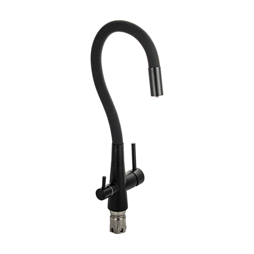 Смеситель для кухонной мойки и раковин с двойным выпуском воды для фильтра, литой черный корпус, из нержавеющей стали марки 304, с высоким С-образным гибким изливом чёрного цвета, шаровый. Крепление резьба - гайка, картридж d = 40 мм, ручка шток. Аэратор для экономии воды. Такая модель может использоваться на домашней кухне, на даче, в медицинских учреждениях и общественных местах. Габаритные размеры: высота 340 - 450 мм, длина 250 - 300 мм, диаметр посадочного седла 45 мм, длина резьбы 55 мм, длина подводки 450 мм. Вес - 2,450 кг, объём - 0,00700 м3. В комплекте паспорт, корпус с изливом, подводка 1/2, крепеж, набор прокладок.